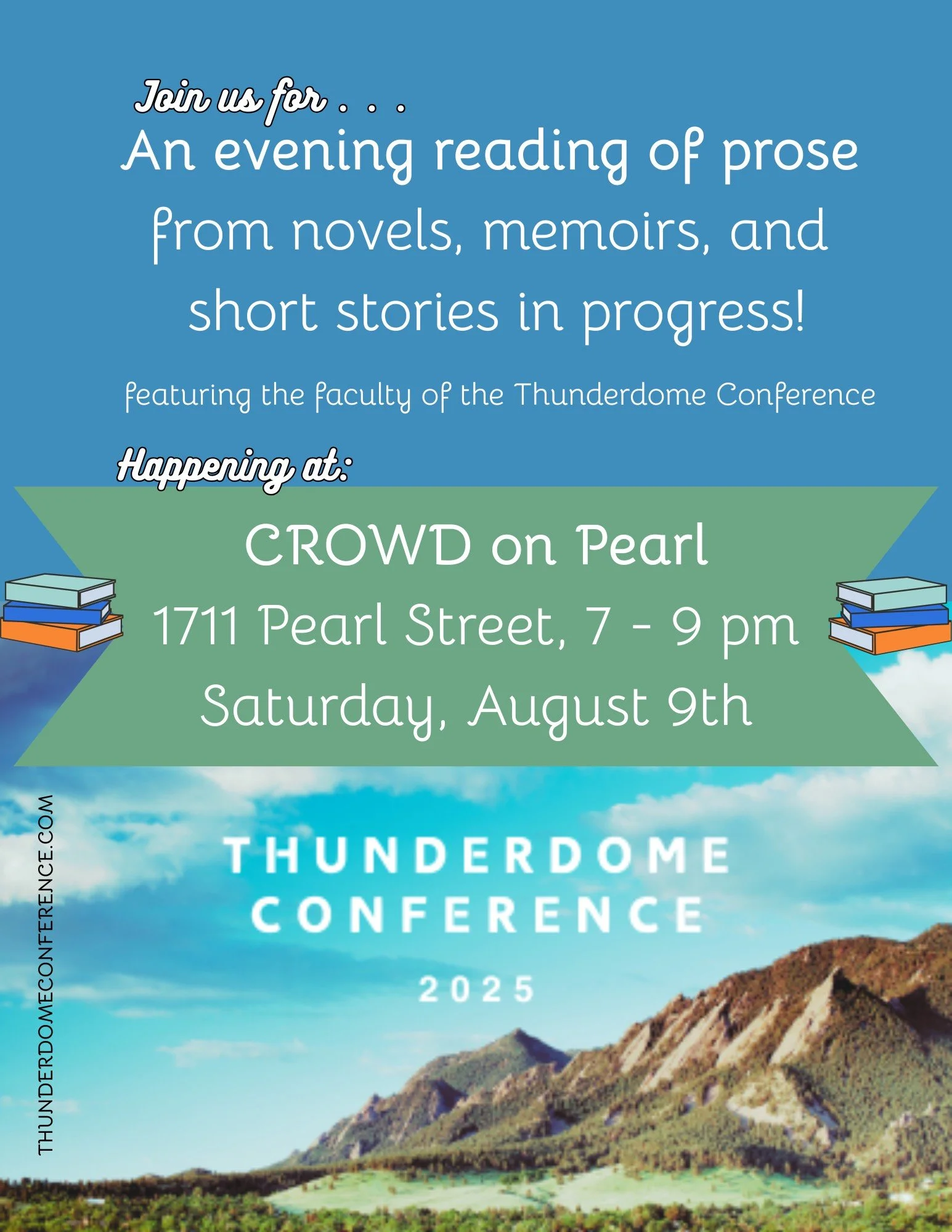 Join us for an evening of reading in downtown Boulder. Faculty from the Thunderdome Writing Conference, as well as local authors, will read aloud from their works-in-progress. Grab a drink and come listen!